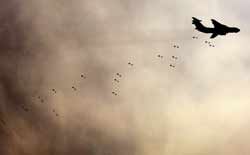 伞兵们“蹼”一落地,就快速解脱伞具,向预定地域集结。指挥员迅速判明前进道路,根据战场空间、双方兵力态势等,精心编组后,立即展开战斗队形。伞降突击群驾驶随机空投的伞兵突击车和战斗车向敌阵地进发;火力突袭群潜伏在预定区域准备对敌实施火力突袭;而防空队则利用随队空投的各种火炮构成了高中低三层火力网;空降保障队迅速收拢集结物资,随时作好伴随保障……强大的集团军突击,犹如合拢的铁拳,势不可挡……
