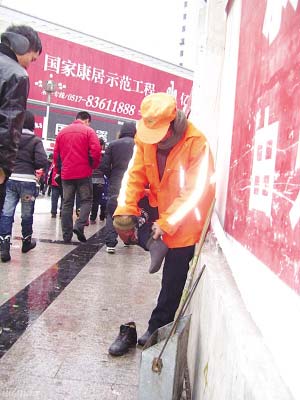 随后,记者又拿着照片来到清河区环卫处,该处孙国庆书记看了一眼照片说:“这肯定是清扫一队的孙美兰”。孙书记告诉记者,42岁的孙美兰干环卫工已有15个年头了,从上班的第一天起就在淮海广场清扫垃圾。据介绍,今年春节前后的两场大雪确实增加了工人的工作量,从11日的第一场雪开始,除了十几名在扫雪过程中摔成骨折的工人外,其余的环卫工人到目前都没有休息一天,在广场的工人平时每人每天要清扫1000斤左右各类垃圾,在下雪的日子里,他们工作量至少翻3倍。