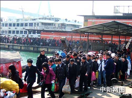 2月20日,一连寂静数日的宜昌港口迎来节后首次农民工出行高峰,19艘客船共10156人直接通过三峡、葛洲坝两个船闸下行抵达了宜昌港。据宜昌港负责人介绍,当天共有37艘普通客船、18艘高速客船出川,创下今年春运以来日出川客流量最高峰。除19艘客船直接抵达了宜昌港外,还有36艘客船未过三峡船闸,直接驶入了三峡坝首的太平溪港和茅坪港,出川农民工下船后再乘转运客车通过三峡专用公路抵达宜昌分流。