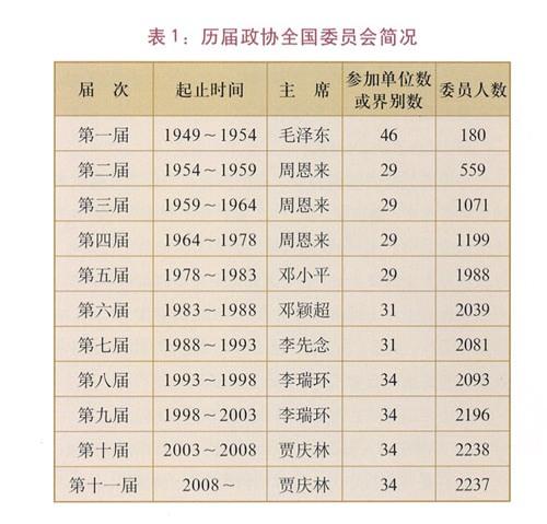 政协全国委员会每届任期五年,设主席、副主席若干人、秘书长。历届政协全国委员会简况如表1。