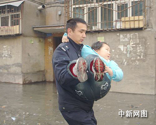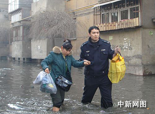大量的融雪性洪水向仓房沟村一带低洼处涌积,致使土柸结构的居民住房被洪水浸泡,有垮塌之险。另一处的大量洪水涌入近处一栋居民楼,民警立即组织警力进入楼内进行施救,挨家挨户动员居民撤离住所,并携老扶幼将妇女儿童带离危险地带。