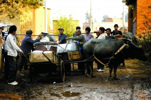 芳华镇双合村口,朱家付牵着牛车挤在人群中。黄牛拉着一个锈迹斑斑的铁桶,那是全家用水的希望。抽上来的水不时的洒到人们身上,孩子们嬉笑着。