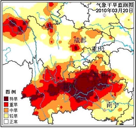 3月16日,云南省气象局称,该省干旱为:秋、冬、春连旱,全省综合气象干旱重现期为80年以上一遇,其中滇中、滇东、滇西东部的大部地区为100年以上一遇。据了解,旱灾已经造成云南省3000多万亩农作物受灾。3月,受灾人数已超越700万人。