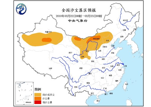 中新网3月22日电 中央气象台22日06时发布沙尘暴蓝色预警:受冷空气影响,22日08时至23日08时,南疆盆地、甘肃中部的部分地区、内蒙古中西部、宁夏大部、陕西北部、华北北部等地有扬沙或浮尘天气,其中,南疆盆地东部、内蒙古中西部偏北的部分地区有沙尘暴,上述地区并有5~6级偏北风,阵风风力可达7级。