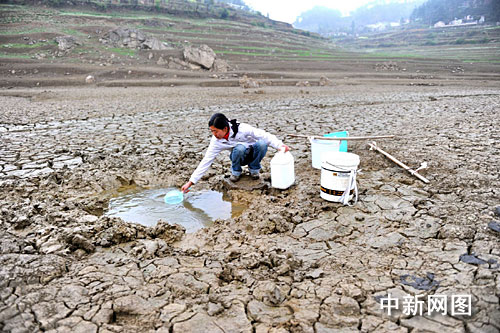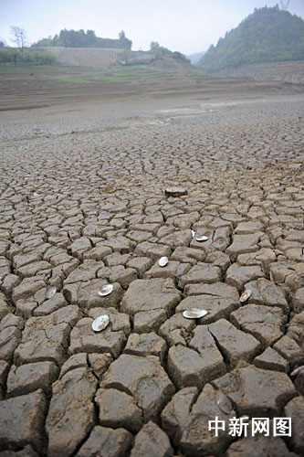 中新网贵阳3月24日电 题:贵州开阳县干旱灾区见闻:饮用水源库底水族成“化石”