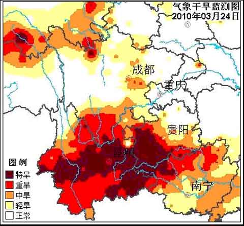 另据3月24日农业干旱综合监测表明,云南大部、贵州中南部、四川南部、广西西部仍存在中度以上农业干旱,其中云南中部、贵州西南部、广西西北部为重旱。