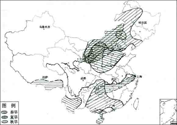 2005年我国降水总量较常年稍偏多,其中西北西部、青藏高原北部、黄淮南部偏多3成至1倍,南疆部分地区偏多1倍以上,而宁夏、内蒙古、北京、贵州等部分地区偏少1~3成,全国其余地区降水量则接近常年。年内,降水分布比较均匀,没有出现大范围、持续时间长的严重干旱,旱情较常年轻;但华南南部出现严重的秋冬春连旱,云南发生近50年来少见的严重春旱,西北东部以及内蒙古等地发生夏秋连旱,江南西部、华南一度秋旱明显。全年受旱面积较大或旱情较重的有内蒙古、宁夏、山西、陕西、广东、广西、海南等省(区)。2005年旱区分布如图所示。总体看来,全国严重持续性干旱范围较小,损失偏轻,受灾面积远低于20世纪90年代以来平均水平。