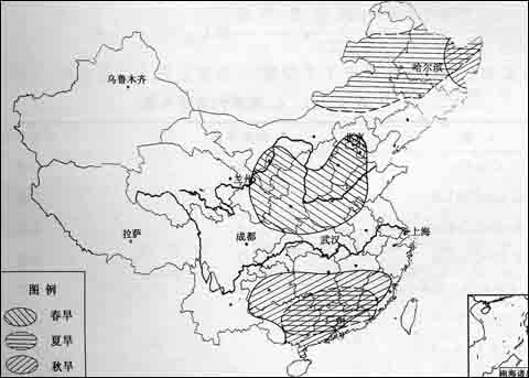 2007年我国年降水总量接近常年,但降水空间分布不均。与常年比较,西多东少,其中西北地区中西部明显偏多、东部地区中间(淮河流域)偏多、南北偏少,其中北京、内蒙、黑龙江、江西、湖南、广东等地较常年偏少1~3成,发生了不同程度的干旱。年内我国部分地区发生了大范围、持续性的严重干旱,主要的干旱事件有:华北、西北、黄淮部分地区发生大范围春旱,四川盆地出现初春旱;内蒙古、辽宁和吉林初夏旱严重,黑龙江遭遇历史罕见夏旱;江南、华南大部分地区7月至8月上旬降水持续偏少,伏旱严重;9月上旬至12月中旬,江南、华南又发生了50年一遇特大秋旱连初冬旱。2007年,受旱较重的省(区)有:黑龙江、内蒙古、吉林、宁夏、湖南、江西、河北、河南、陕西等。总体来看,2007年,我国干旱范围较大,局地干旱非常严重;全国因旱受灾面积多于1991年以来的平均值。