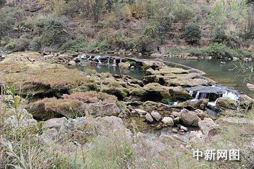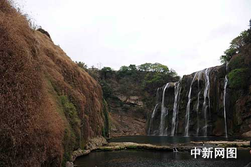 瀑布下的水潭,裸露出在河床底部的石头,顺着水流的方向一眼望去,不少石头上竟长满了青草。记者从景区工作人员处获悉,受这次大干旱的影响,黄果树瀑布的上游来水减少,使瀑布景观渐受影响。到了3月,本是汛期的当地却无雨水可降,大瀑布现每天依靠水库闸坝调节维持景观。