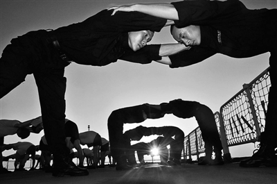 谈起“护航健身操”,长期工作在高温、高湿、噪音大的机舱里的机电部门官兵深有感触。主机班班长王伟说:“每天早晨和下午,迎着朝阳和夕阳,在甲板上吹着亚丁湾的海风,呼吸着新鲜空气,配合音乐做健身操,能让大家全身放松,感觉很惬意也很舒服。”