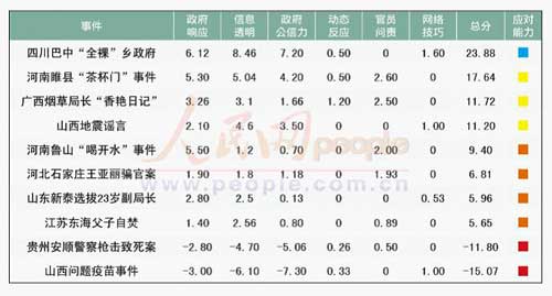 人民网舆情监测室今天发布了“2010年第一季度地方应对网络舆情能力排行榜”,对2010年第一季度地方党政机关应对舆情热点事件的得失进行考评。四川巴中“全裸”乡政府因为在信息透明度、政府公信力等指标上一枝独秀,进入总体较为得体的蓝色区域,而贵州安顺警察枪击致死案、山西问题疫苗事件则被判定为应对严重失当,被亮起“红色警报”,值得反思。中国人民大学公共政策研究院执行副院长毛寿龙教授在点评山西疫苗事件时就指出“问题一个系统又一个系统的出,再一个系统一个系统地去治理,显然不是一个好办法。所以,现在是各个领域都需要很好重视的时候了”。