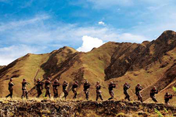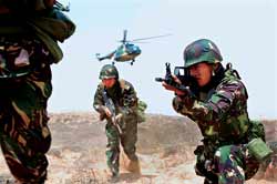 西藏高原,崇山峻岭。随着一声令下,身穿山地迷彩作训服的西藏军区某特种大队兵分突击小组神不知,鬼不觉,用高空垂降山地潜入、险岩攀登等方式秘密接近“敌人”。直升机快速飞临山丘,在离地18米的高空,只见一名特战队员以迅雷不及掩耳之势,打开舱门,甩下一根绳索,在没有任何防护措施的情况下抓住绳索快速垂降,抢占山地,干净利落,分秒不差。在特战队员的合力攻击下,“恐怖分子”被一一“击毙”。这是特战大队反恐训练的一个镜头。