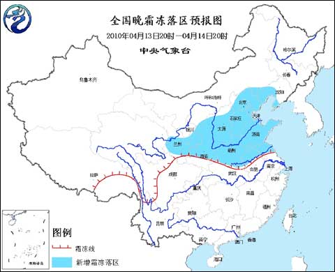 受冷空气影响,预计,13日夜间到14日早晨,辽宁西部和南部、河北、京津地区、山西、陕西中北部、甘肃南部和东部、山东、河南、安徽北部、江苏北部等地将会出现霜冻。
