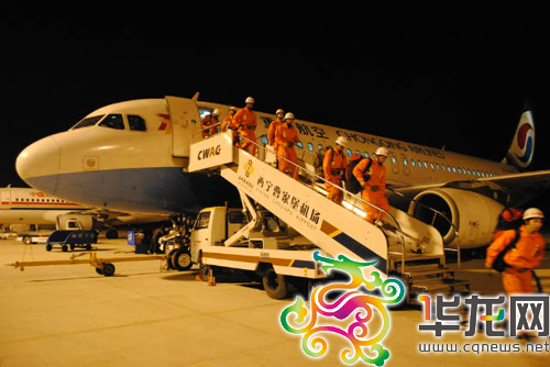 今晨3:30分,经过近两个小时的飞行,由205名消防官兵和5条搜救犬组成的重庆救援队,飞抵青海西宁曹家堡机场。据重庆救援队前指负责人介绍,官兵在机场附近做短暂休整后,将于今日上午8:10分集合,转飞玉树地震灾区展开救援。