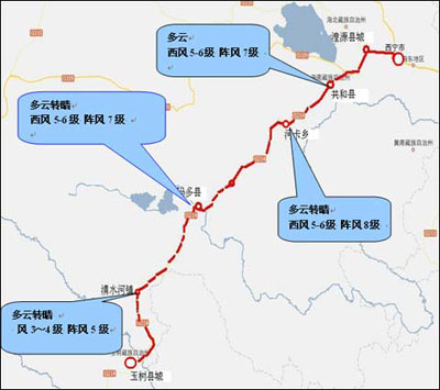 青海省气象局预计,今天白天到夜间,青海全省各地多云或晴,其中海南、果洛北部有6到7级西风,海南的部分地区有沙尘天气。沿途天气对前往玉树震区救灾车辆会有一定影响,请前往灾区的救援人员注意防范。