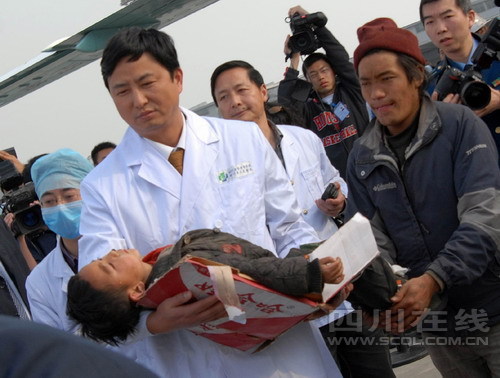 下午5时10分,空运到成都的首名伤员被抬上第一辆救护车,伤员的口、鼻、眼睛布满了血痂,手腕、手臂上全是伤痕。抬上担架后,随车主治医生余海放立即对其测量血压、心率,询问有何不适,并进行了登记。伤员的右手腕上拴着红布绳,这是地震灾区医生经过初诊后认定是重伤员的标记。