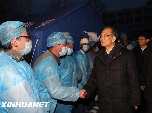 在渐渐沉下的暮色中,温家宝又来到玉树州人民医院,走进医院大院里搭建的帐篷里,看望受伤的群众。