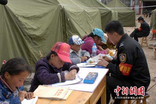 中新网成都4月18日电(陈凤丹) 18日上午9点,位于玉树县民族中学的成都特警队员驻地里,地震后的第一堂课开课了。