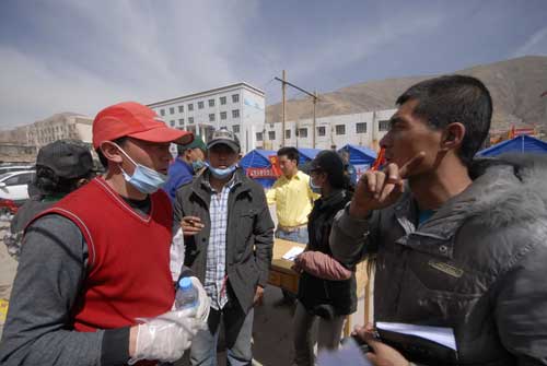他的名字叫高树友。在现场负责招募志愿者的玉树团州委干事扎西告诉我,地震发生后几小时,满身是土的高树友跑来了,找到我们要求当志愿者。“当时现场还很乱,我们随便找了一张纸,高树友写下了第一个名字”,扎西从桌上拿出一个写满名字的纸说:“就是这样的纸,现在已经写满几十页,有400多人报名了,地震当天有30多个。高树友不仅是第一个报名,而且帮助我们组织志愿者,这个招募点就是我们一起搭起来的。”