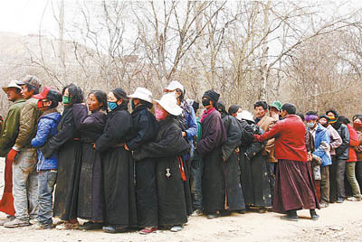 在玉树,随处能发现信仰的力量,比如蜷坐在破墙一角转动经轮的女子和一边赶路一边抽空念几句经文的少年。在阳光灿烂的下午,在新建路66号的废墟边还能见到66岁的阿周。他坐在抢救出来的沙发上,用平淡的声音反复读着手里超度死者的《平安经》。小册子有些陈旧,封皮用胶带缠过几次,他读一页,就用手指蘸着唾液翻过去,边角已被翻黑了。