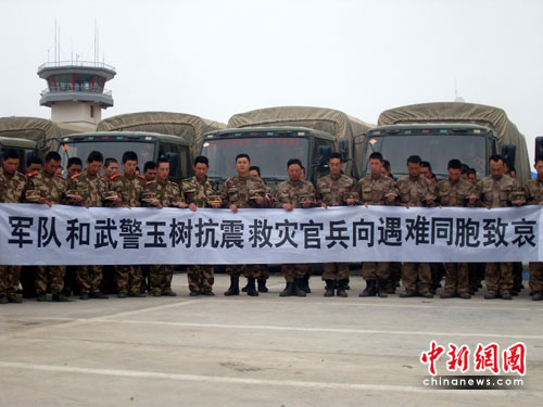 中新网4月21日电(刘洪星)今日,玉树灾区巴塘机场武警青海总队第四支队全体官兵、全体解放军部队、医疗单位、机场工作人员以及其他救援人员在候机楼前停车场举行三分钟默哀活动,现场降半旗,所有人员驻足默哀、所有车辆鸣笛、防空警报响起。同时玉树州所有救援部队、救援单位、各级人员同期举行为地震死难人员默哀活动。