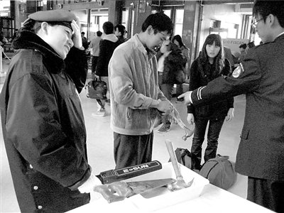 记者21日获悉,为确保上海世博会安全,北京铁路警方根据铁道部、公安部日前联合发出的通知,从即日起至11月15日,将对登车旅客随身携带的物品以及通过铁路托运的行包进行特别安检。据了解,旅客不得随身携带上车的物品除了管制刀具以外,餐刀、大型水果刀、剪刀、锤子等利器和钝器也在禁带之列。