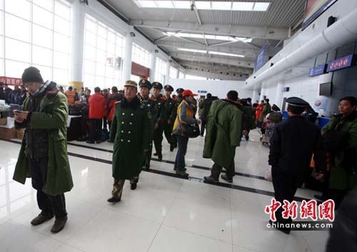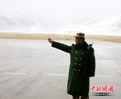 中新网青海玉树4月22日电(石磊记者刘忠俊)22日5:10分,青海玉树灾区阴云密布,天空下起大雪。为确保唯一空中生命线的畅通,武警青海总队驻巴塘机场官兵加强机场安全保卫工作。