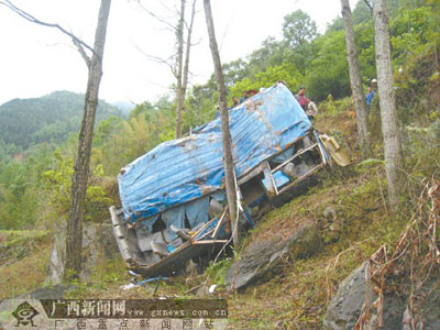 东兰讯 4月22日上午9时许,一辆由大化瑶族自治县七百弄乡开往河池市的客运中巴车,在途经东兰县花香乡干来村时突发机械故障,导致车辆滚下90米长陡坡(垂直高度40米)。事故造成车上7名乘客先后死亡,35人不同程度受伤。