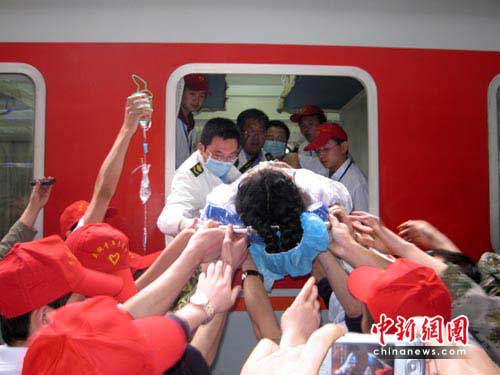 随后,在“小心!小心!平移!平移!”的声音中,铁路人和医务人员将病人放上担架,并轻轻从窗口递出,窗外每辆担架车两边分别等候着的5名志愿者和4名医护人员,也是格外小心的轻举着从窗口传出的伤员。