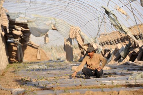 记者在恰特喀勒乡设施农业基地看到,大棚遭到大风不同程度的毁坏,棚顶的塑料薄膜全部被大风吹烂,大棚内的西红柿、茄子等蔬菜被风沙侵袭后干枯,一些已经挂果的蔬菜也大面积枯死。