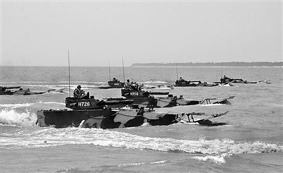 “轰隆隆!”刹那间,海岸一线硝烟弥漫。10多辆战车如蛟龙出水,咆哮着向岸滩疾速驶来。车载速射火炮实施行进中射击,一道道火焰从炮口喷出,“敌”火力点被拔除,岸防工事被摧毁。战车后门打开,随车陆战队员鱼贯而出,直扑“敌”滩头阵地……