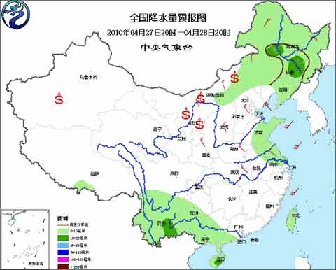 27日20时至28日20时,内蒙古东部、东北地区大部有小到中雪(雨)或雨夹雪;黄淮东部、江淮东部、川西高原南部、贵州西部、云南、广西大部、广东西南部、海南及台湾等地有小雨或阵雨,其中云南南部及海南南部的部分地区有中雨;上述局部地区并伴有雷雨大风等强对流天气。西北地区东部、内蒙古大部、华北大部、东北、黄淮、江淮中东部有4~6级风;南疆盆地、内蒙古中部、西北地区东北部、华北西部和北部等地的部分地区有浮尘或扬沙天气。渤海、黄海北部有5~6级、阵风7级的西北风转偏西风;黄海中南部、东海北部有6~7级、阵风8~9级的偏南风转西北风。