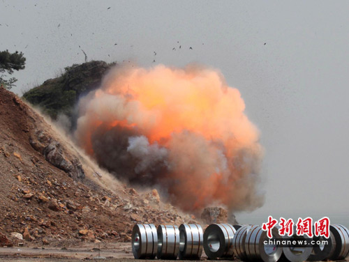 中新网九江4月28日电(胡国林 李涛渊)“一、二、三”,随着一声令下,4月27日中午,在江西九江都昌县矶山湖附近一偏僻的时子山脚下,立即出现一个巨大的“火球”,原来,这里正在实施销毁日军侵华时期遗留下来的炮弹。