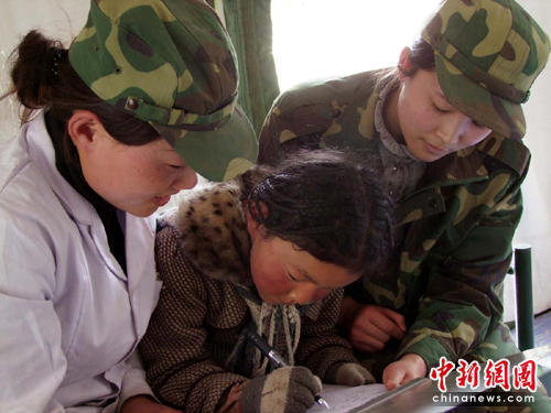 “4.14”玉树地震让家住结谷镇赛马场的索南巴毛的家倾刻间变成一片废墟,所幸的是家里五口人除了妈妈措吉腰部被房屋的大梁砸伤,其他人都逃了出来,没有受伤。4月17日早晨8点,连夜赶到灾区的解放军第25医院医疗队巡诊到索南巴毛家门前。可爱的小姑娘紧紧地拽住医疗队沈中斌主任的衣角,用不太流利的汉语说:“叔叔,叔叔,快到我家看看,我妈妈被砸伤起不来了。”看着说话的小姑娘,沈主任摸摸她的头,用一口四川话说:“快到前面带路,我们过去看看。”