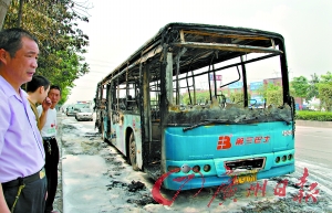 昨日上午9时左右,在白云区人和镇秀水村,一辆840公交车在行驶途中突然冒烟起火,大火将公交车烧得只剩铁架,幸好司机及时疏散车上乘客,因此并未造成人员伤亡。 (记者庄小龙、李栋 实习生曾玲摄影报道)