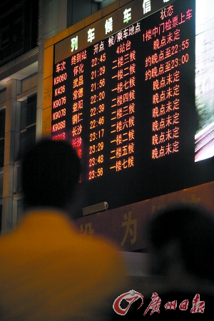 “已经等了3个多小时了。我是请假陪女儿去旅游的,现在多扫兴。”邬女士在电话中对记者抱怨。邬女士原本打算乘坐晚上8时05分的广州至张家界列车。7时许,她和女儿赶至候车大厅,随即被告知受灾情影响,列车晚点了。铁路工作人员告诉乘客,可以全额退票,也可换第二日的票。“当时很多人涌去了退票窗口,上千人挤在一起,很壮观,跟春运一样。由于退票换票的人实在太多,与此同时,广场大屏幕开始滚动显示受到影响晚点的列车。晚上9时许,邬女士决定退票,被铁路工作人员告知,她们乘坐的列车可能今晚就会开出。“我是特意请假陪女儿去旅游的,今晚能开车那我肯定不愿意退票了。”于是,邬女士母女决定继续等。但直至晚上10时,她们还是没能上车。此时,由于陆续有列车开车,广场上的人流少了一半。尽管郁闷,但邬女士还是显得很有耐性。“不过有人开始发脾气扔行李了。”邬女士告诉记者。