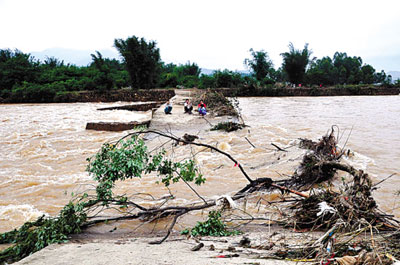6日下午18时左右,位于乳源境内的国道323线K426+360处大型涵洞被洪水冲毁,造成路面出现一个14.5米深的大洞,被毁路基长90米、路面1000平方米、挡土墙2500立方米,致使交通完全中断。公路部门已在现场设置了安全警示标志,并在可绕行路口设置指示标牌,安排人员疏导过往车辆改道行驶。抢险队经研究决定:先在该路段被冲毁的桥涵缺口旁埋设一条约2米长的涵管,并力争用三天时间完成便道的铺设工作,解决暂时的通车问题;待洪水过后,再在损毁路段新架一座桥梁彻底解决此处通车问题。