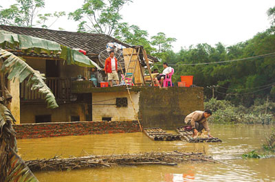 同为翁城镇的富陂村由于多是土砖房,受灾更为严重。走进村子,几乎找不到几间完整的房子,村民们忙着从断壁残垣中找寻着能用的衣物和化肥。富陂村第七小组的村民告诉记者,该组250间房80%都已倒塌,100多村民无家可归。前天下午,洪水来的时候,多数村民们已经在干部们的劝说下安全撤离,然而,仍有50名群众被困水中。由于没有冲锋舟,乡镇干部只能找来竹子扎成竹排来回救人。水流太急,竹排不好使,干部们又找来铁船,铁船不听使唤,干部们只得趟着淹到脖子的洪水拖着铁船抢救剩下的群众。