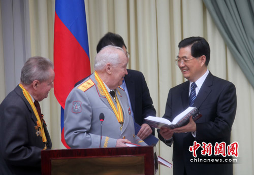 胡锦涛向俄罗斯老战士们发表讲话,并向他们颁发“和平”奖章和证书。