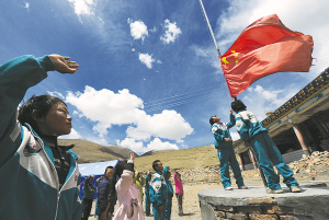 “玉树永远是我家”,甘达村玉树第一希望小学的孩子们也深有体会。昨天是虫草假(相当于暑假提前两个月,因为五六月间,孩子要回家帮忙挖虫草)前最后一天上课,校长尼玛召集全校109名学生,在旧教学楼废墟前,举行了一场升旗仪式。