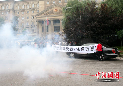 宣判结果宣布不久,数十名普通百姓在重庆高级人民法院拉起“判处文强死刑,法律万岁”的横幅,并放起鞭炮以示庆祝。