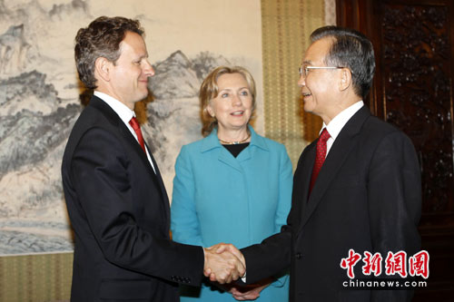 中新网北京5月25日电 (记者 张朔)中国总理温家宝25日下午在中南海紫光阁会见来华出席第二轮中美战略与经济对话的美国国务卿克林顿和财长盖特纳。