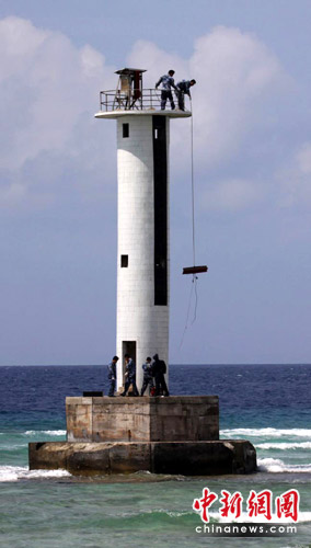 记者随该基地勤务船大队南运832船开始航标维修任务。第一站是北礁灯塔,这个灯塔作用十分重大,过往船只都要通过它来核对航海参数。这是一个建在泻湖上的独立灯塔,航标队当天要更换灯塔上到期的蓄电池。官兵们抬着2块35公斤的蓄电池、1台40公斤的发电机以及其它检修设备,淌过没膝深的浅滩走30多米,才到达灯塔基座的台阶。
