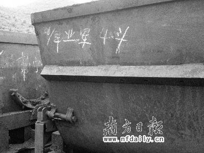 记者昨日在现场看到,矿井出口处摆着9名死难矿工的遗体,遗体旁是一排车斗,一个车斗上还有工头用白色粉笔记录下的死者李业军5月26号的产量———早班4斗。