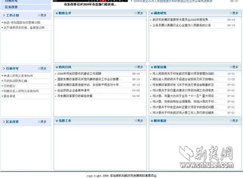 记者随即登录武汉市发改委政务公开网站。在该网站首页记者发现,除“来信选登”一栏开天窗以外,其它栏目的信息更新还比较及时。可当记者点击进入子栏目时,就不是那么回事了。“常见问题汇总”、“表格下载”、“项目稽查”、“财政公开”等十几个子栏目,均无任何内容,只有大片空白。此外,在市民具体办事的“业务专栏”栏目下,24个子栏目内容惊人地一致,几乎全是空白框架。