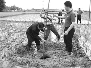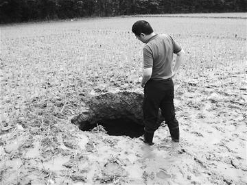 3天后,崇州市怀远镇村民周先生也发现了一个“天坑”。周先生说,他路过邻居家一块秧田时,秧田里突然喷水,势如泉涌。水停后,原本好好的秧田竟出现一个1米多深的“天坑”。