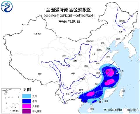 预计,6月8日20时到6月9日20时,河南南部、湖北东部、安徽、江苏西部、湖南南部、江西、浙江、福建中北部、广西、广东中西部的部分地区有大到暴雨,其中,安徽南部、江西东北部、福建北部、广西东北部等地的局部地区有大暴雨;上述部分地区还将伴有短时雷雨大风等强对流天气。