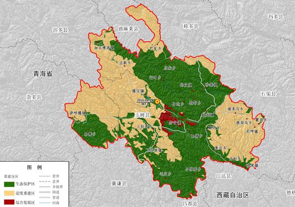 灾后恢复重建要与三江源、隆宝自然保护区规划相衔接,根据资源环境承载能力综合评价,将规划区国土空间划分为生态保护区、适度重建区和综合发展区。