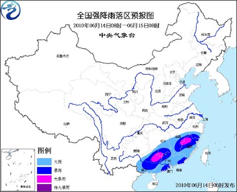 预计,6月14日08时到6月15日08时,湖南南部、江西中南部、浙江南部、福建大部、广东大部、广西大部等地有大到暴雨,其中,广西东北部、湖南东南部、江西中部偏东地区、福建西北部等地的局部地区有大暴雨,上述部分地区并伴有短时雷雨大风或冰雹等强对流天气。