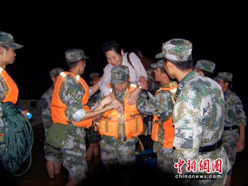 20日凌晨1时,南京军区海防某部摩托行军9个小时,从福清用17辆卡车带着200多名官兵和冲锋舟赶到建阳,一到就接受到首批任务,分2批3个点营救建阳当地被困群众。